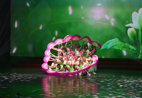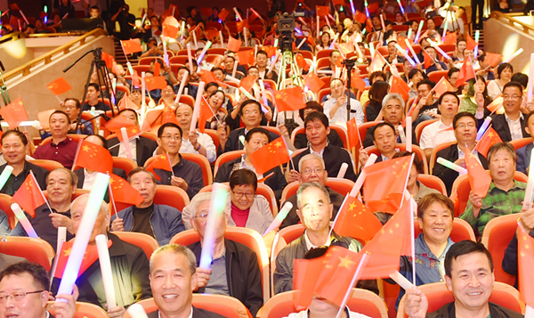 情景表演《歲月如歌》,歌舞《我們的幸福生活》《我愛你中國》《美好新時(shí)代》,舞蹈《追夢(mèng)》《出水蓮》《茉莉花》《絲路霓裳》《燃青春》,熱情謳歌黨,謳歌祖國,謳歌人民。現(xiàn)場(chǎng)觀眾舞動(dòng)手中的國旗,人民劇院成了一片紅色的海洋。